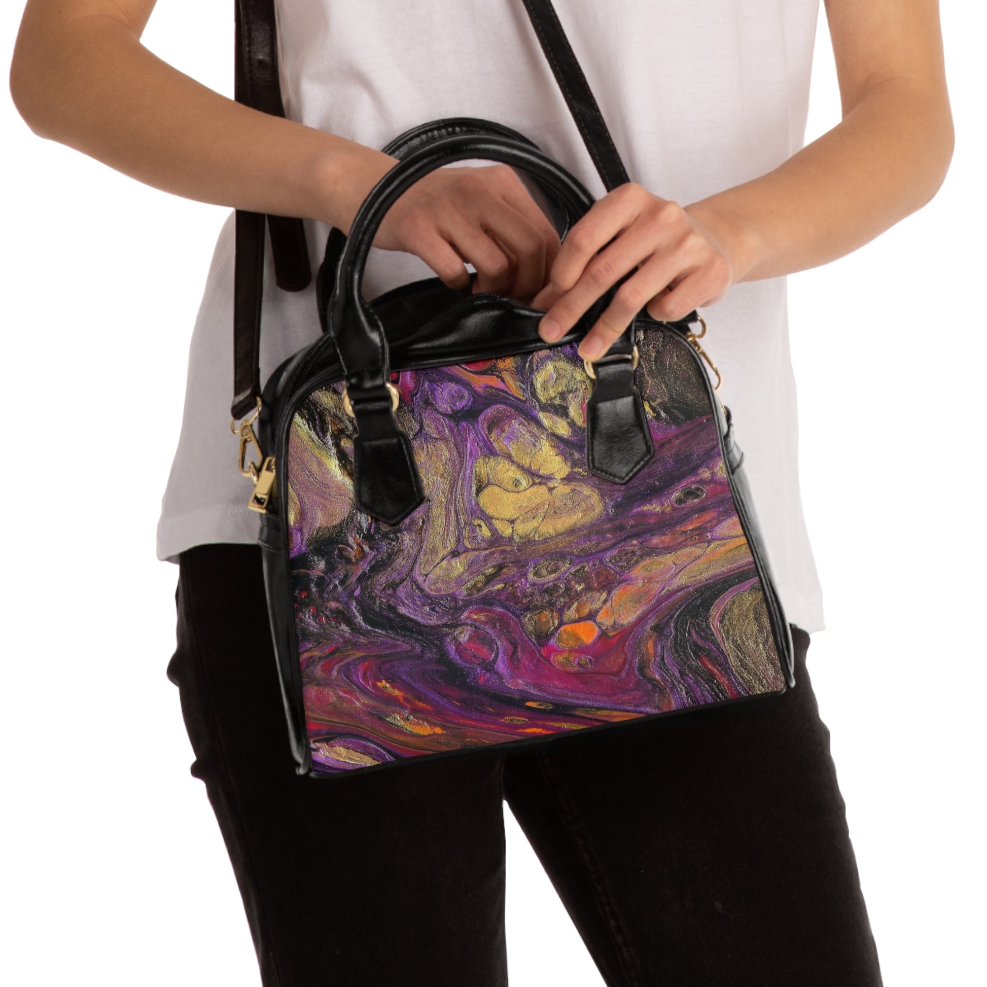 A stylish and versatile shoulder handbag featuring a fluid art design with vibrant purples, reds, oranges, pinks, and gold on a black background. Perfect for those who love bold and colorful accessories, this handbag adds a touch of artistry to any outfit. Ideal for individuals looking for a unique statement piece to carry their essentials in style during parties, special occasions, or everyday outings.