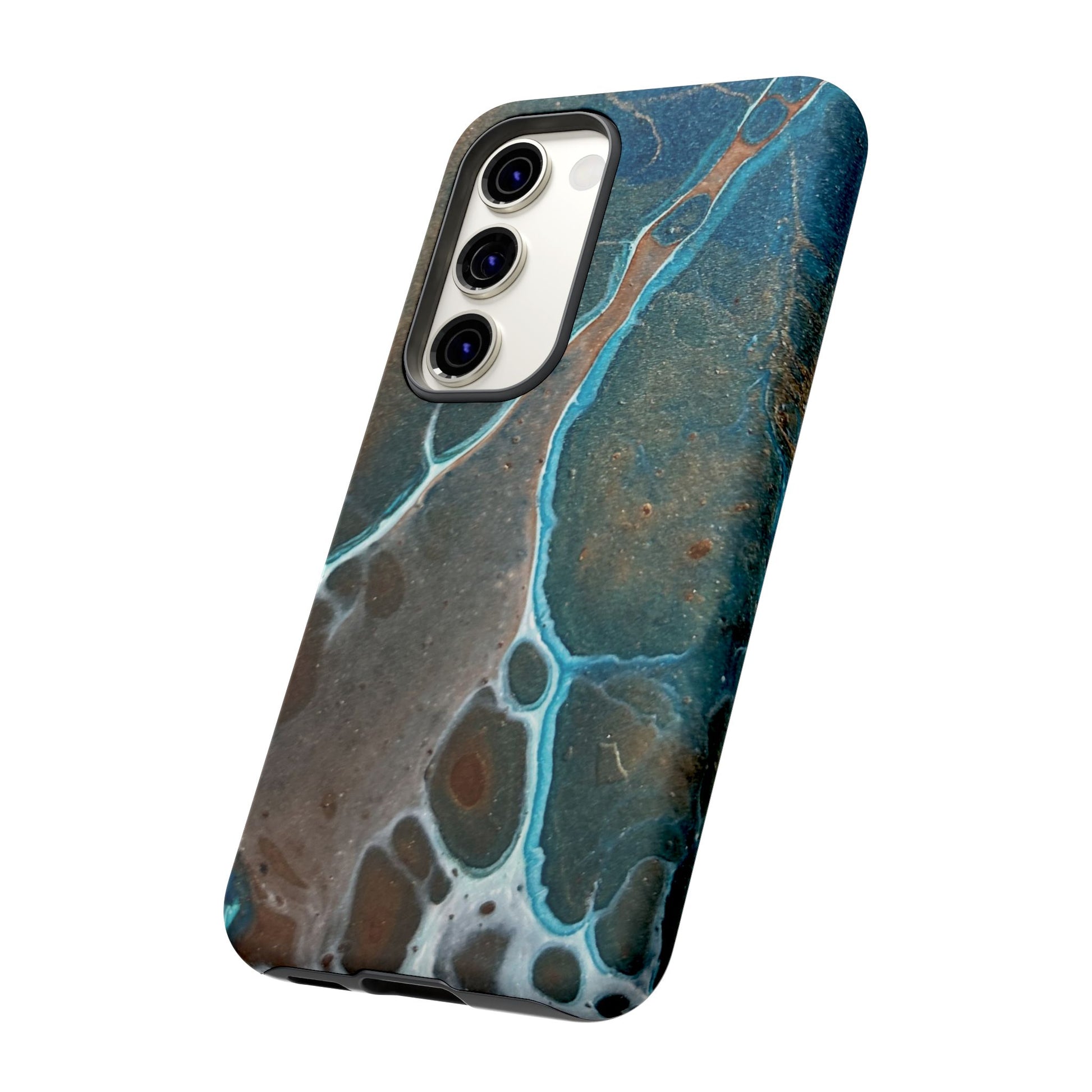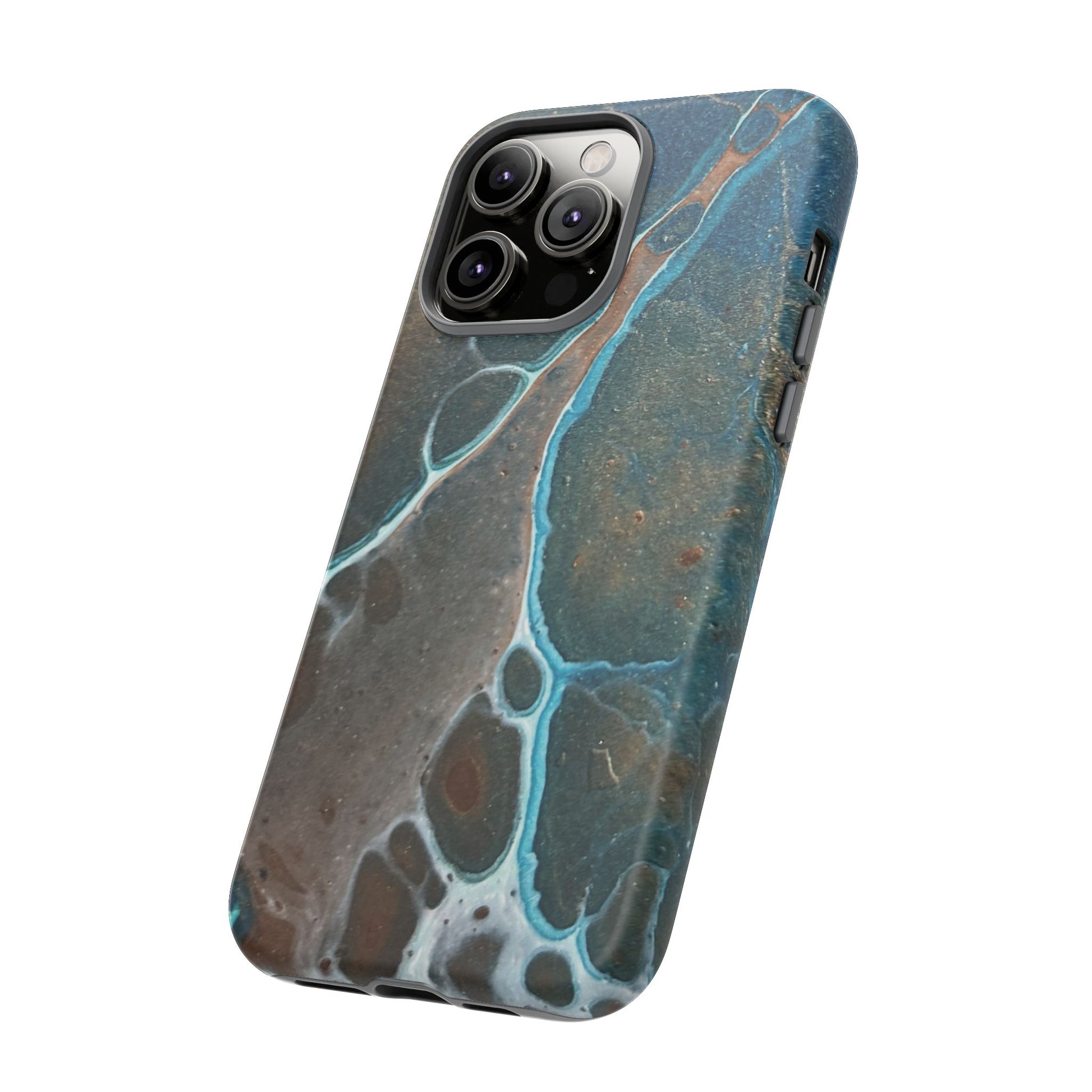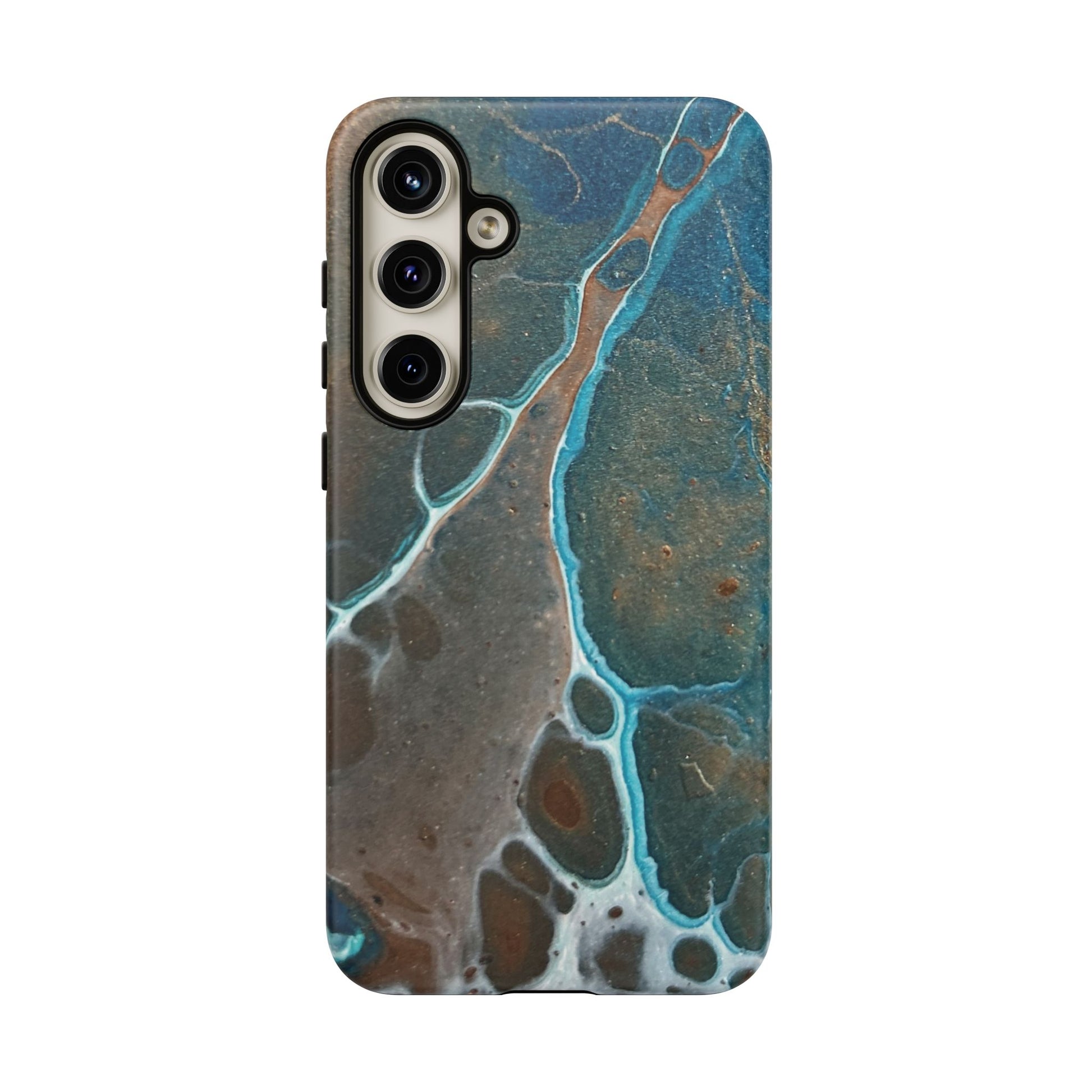 Inspired by the natural beauty of mineral formations, the striking Earthglow Tough Case is a vibrant, abstract design reminiscent of verdigris patina. The cover's rich, swirling patterns in shades of teal and copper are set against a deep, moody background, evoking the elegance of earth's geological wonders.