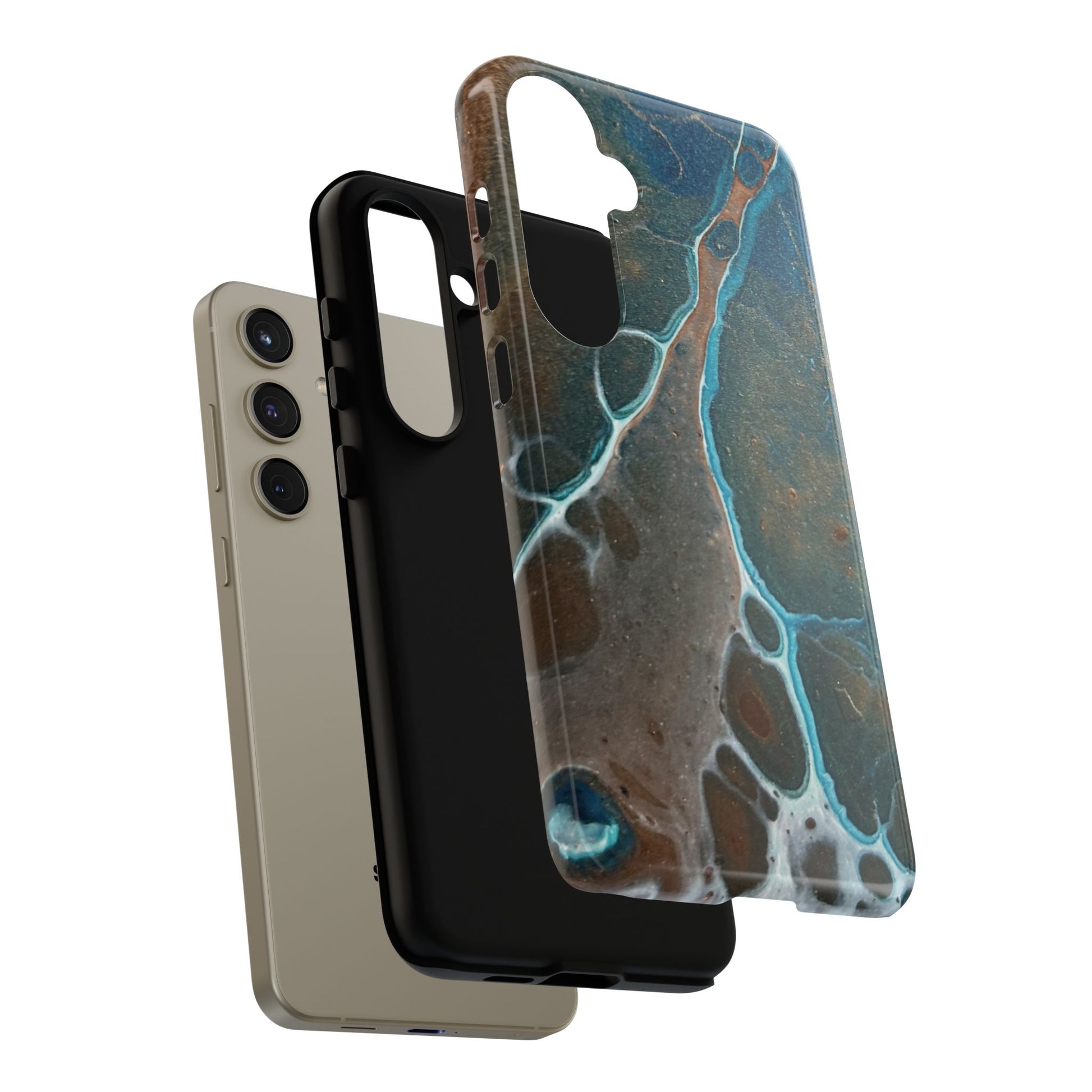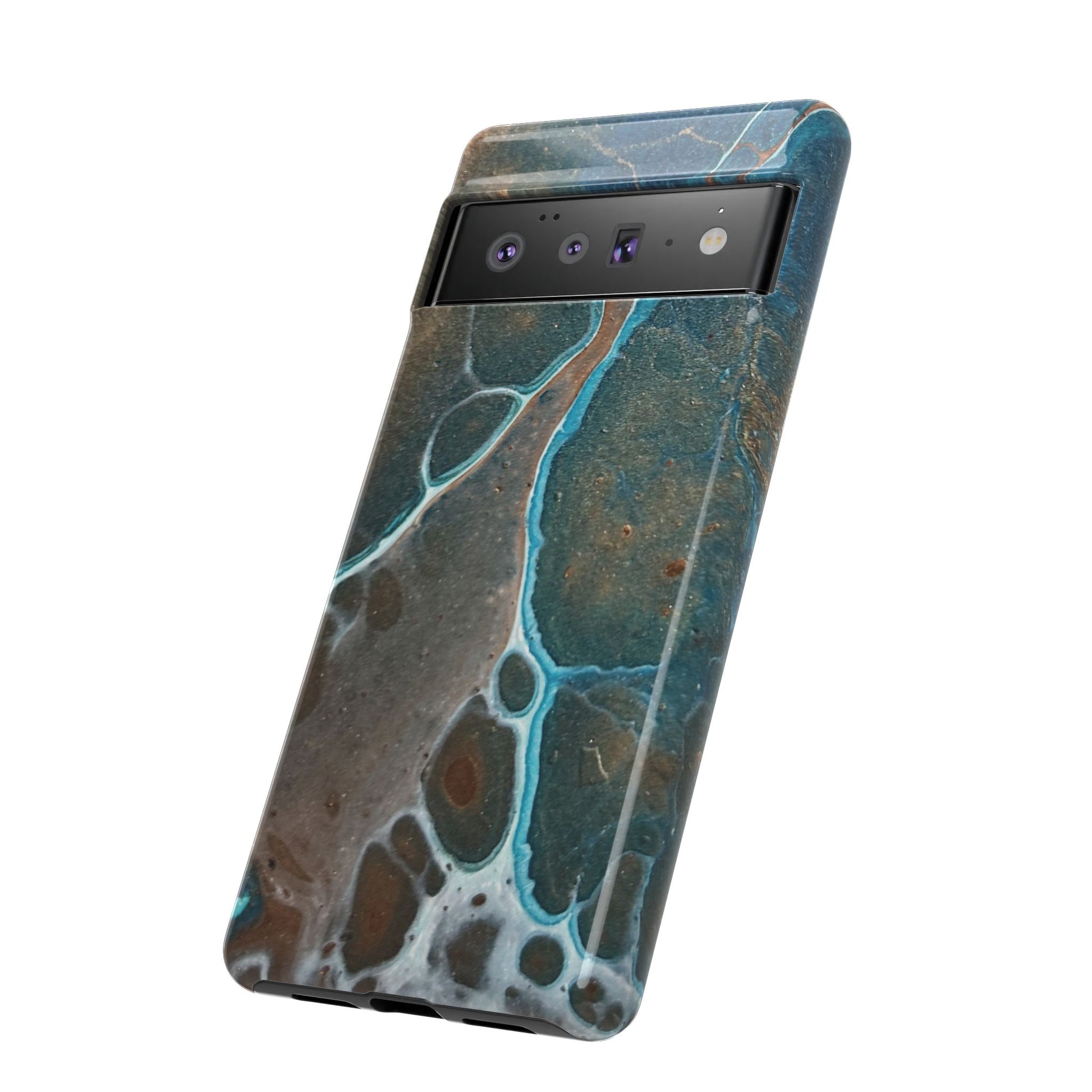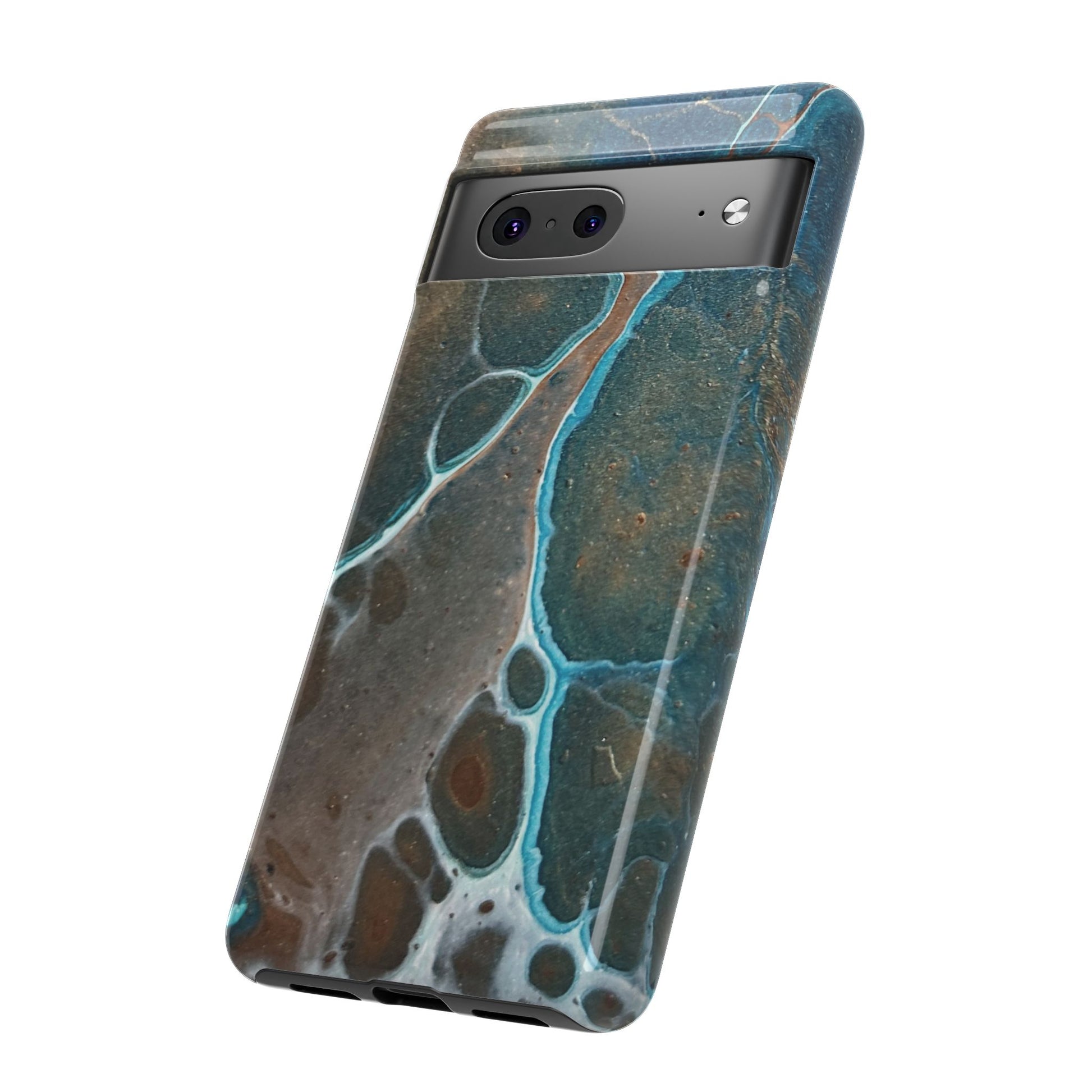 Inspired by the natural beauty of mineral formations, the striking Earthglow Tough Case is a vibrant, abstract design reminiscent of verdigris patina. The cover's rich, swirling patterns in shades of teal and copper are set against a deep, moody background, evoking the elegance of earth's geological wonders.