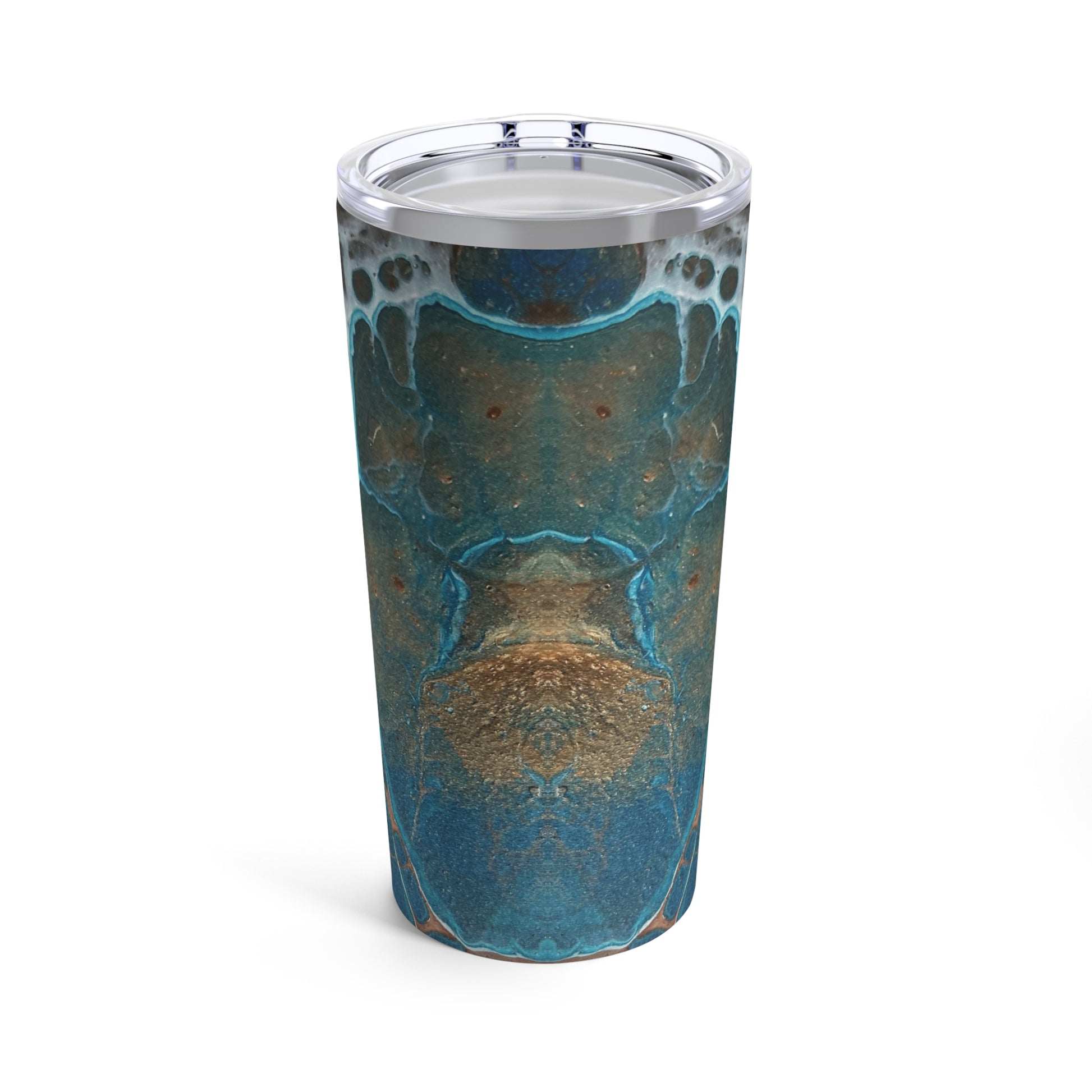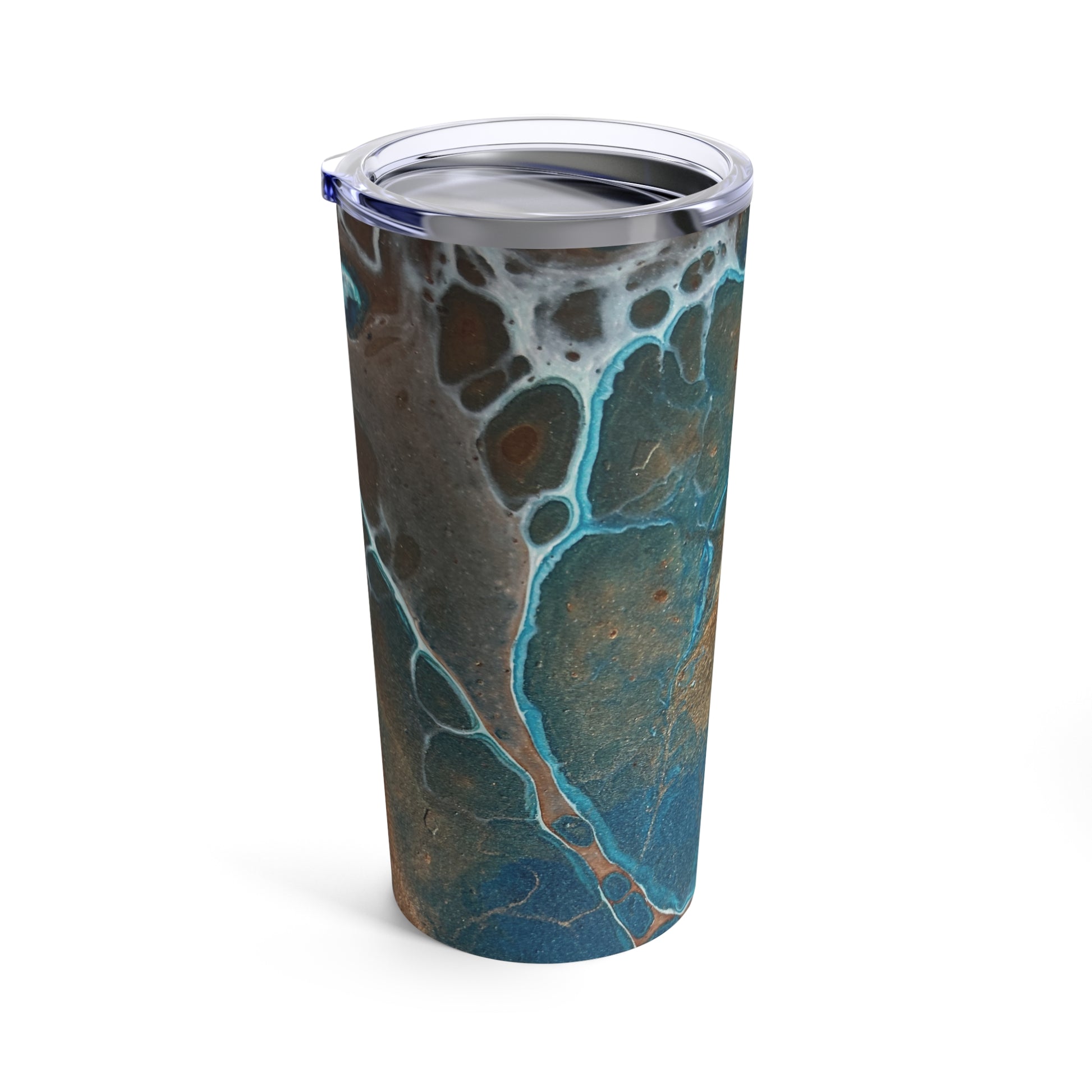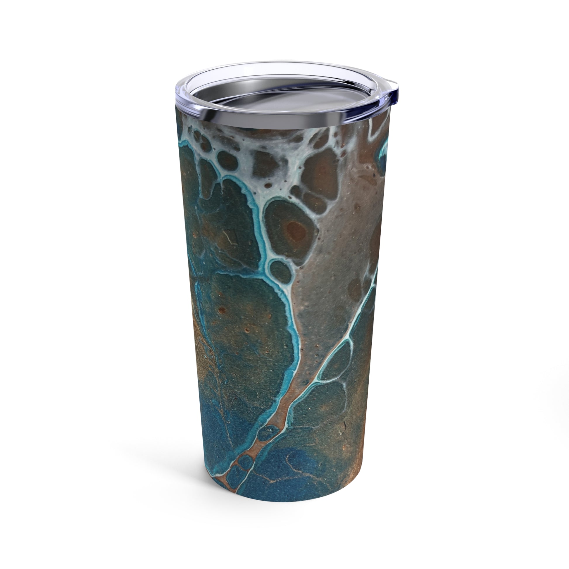 Inspired by the natural beauty of mineral formations, this tumbler is an excellent choice for daily use to keep 20oz of your favorite beverages hot or cold thanks to the double-wall insulation. The striking abstract fluid art design features is reminiscent of verdigris patina with rich swirling patterns in shades of teal and copper set against a deep, moody background, evoking the elegance of the earth's geological wonders.