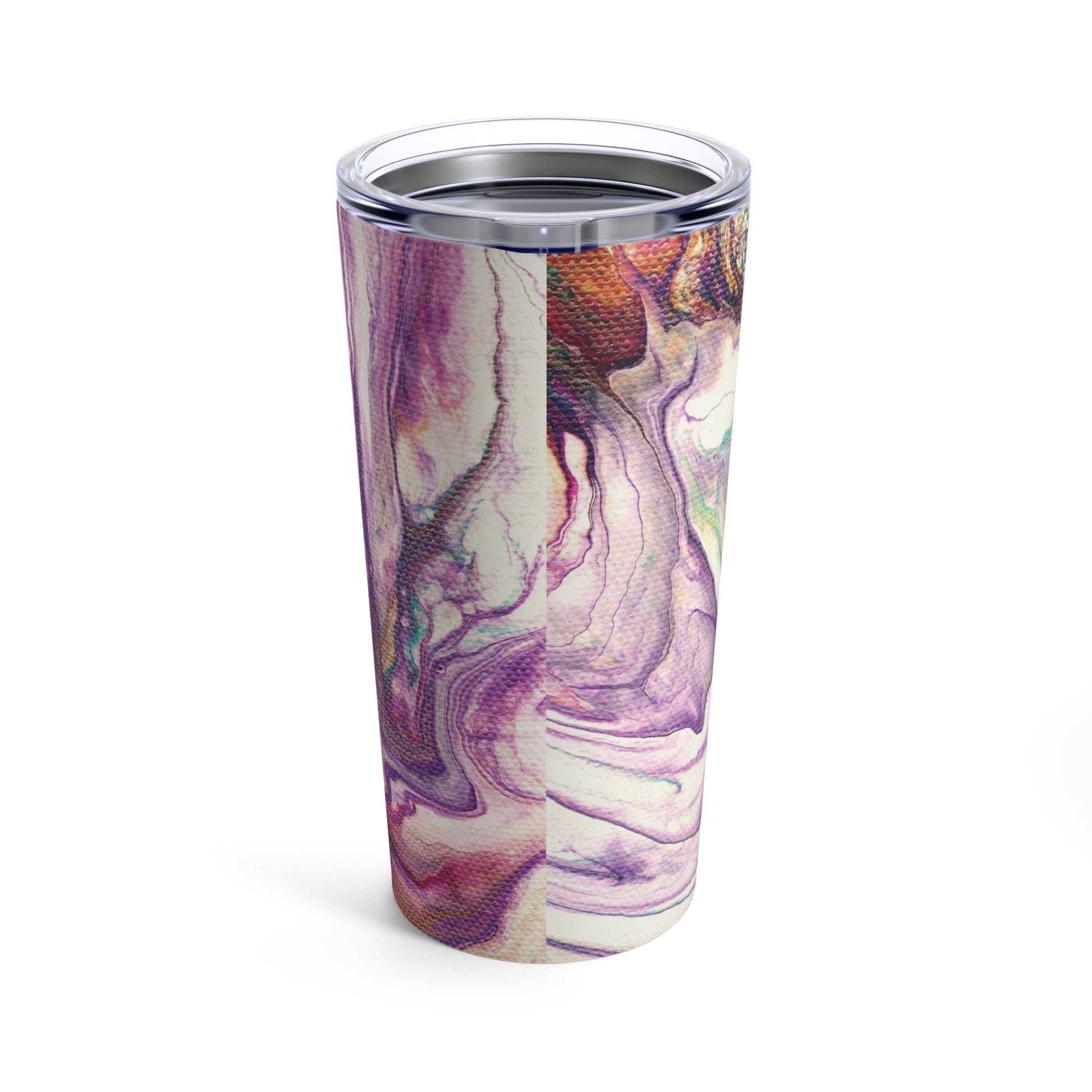 The tumbler features a stunning fluid art painting with a delightful combination of warm tones, including shades of purple, teal, and pink. The colors blend together seamlessly, creating a visually appealing and eye-catching design that is sure to capture the attention of anyone who sees it. The artistic patterns and swirls add a unique touch to the tumbler, making it a one-of-a-kind piece that is both beautiful and functional.